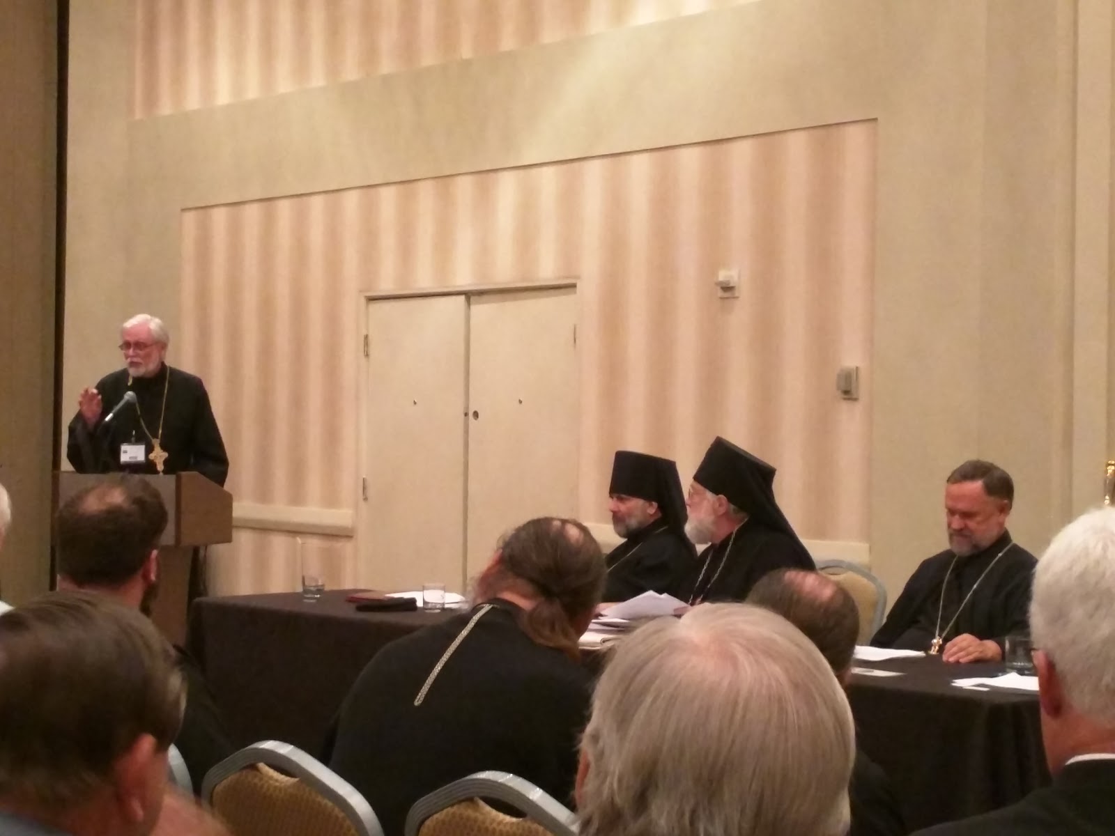 His Eminence, our beloved Archbishop Benjamin, spoke of several very important topics in his opening address. In discussing recent changes in the government’s definition of marriage he said we may need to come to a place where clergy no longer sign a secular marriage license. This suggestion was greeted with applause. The Archbishop spoke of many forthcoming clergy retirements in the diocese, for which we seem to be unprepared or unwilling to accept. He noted, “It is one thing for a priest to die ‘with his boots on’ but another thing entirely for the parish to die with him.” His Eminence was pleased to note that there were several parishes around the diocese that were growing, but many felt as if the overall attitude was “would the last one out please be sure and turn out the power”. He urged us all to read the seven letters to the seven churches at the opening of the St John’s Apocalypse and to see if we found our parish in any of those letters. (These seven letter comprise the 2nd and 3rd chapters of the Revelation of St John.)