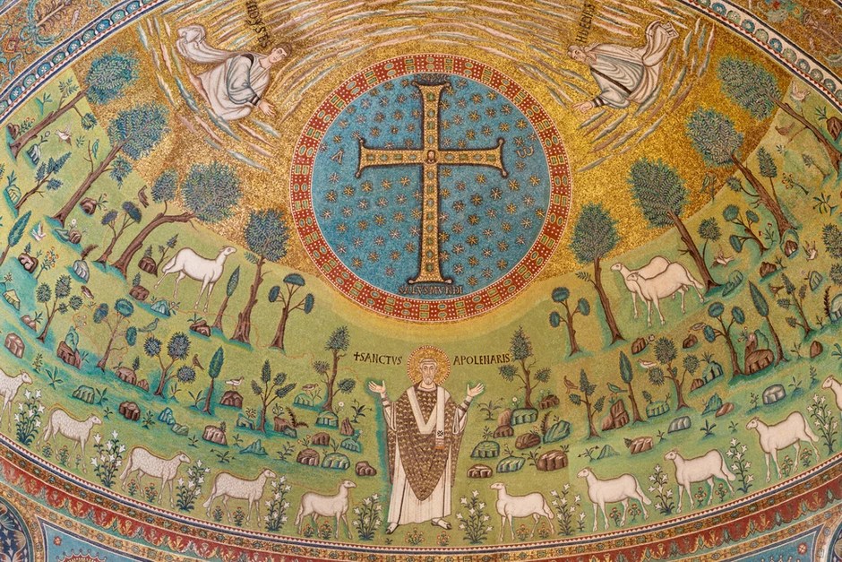 There’s a mosaic in Ravenna, Italy. Floating over a grassy field filled with sheep, safely grazing, a cross is surrounded by a field of stars and radiant light. It’s indicated (pointed to) by radiant beings. There are trees. It’s beautiful and nothing like a Crucifix as we might see in a Church today. (When a Crucifix was first presented – in a Greek Church – the Latin Bishop thought it might be scandalous.) In the center of the cross there’s the Face of the Crucified, shining in glory. It is, as I mentioned yesterday, an image of the Cross as the glory of the Messiah.